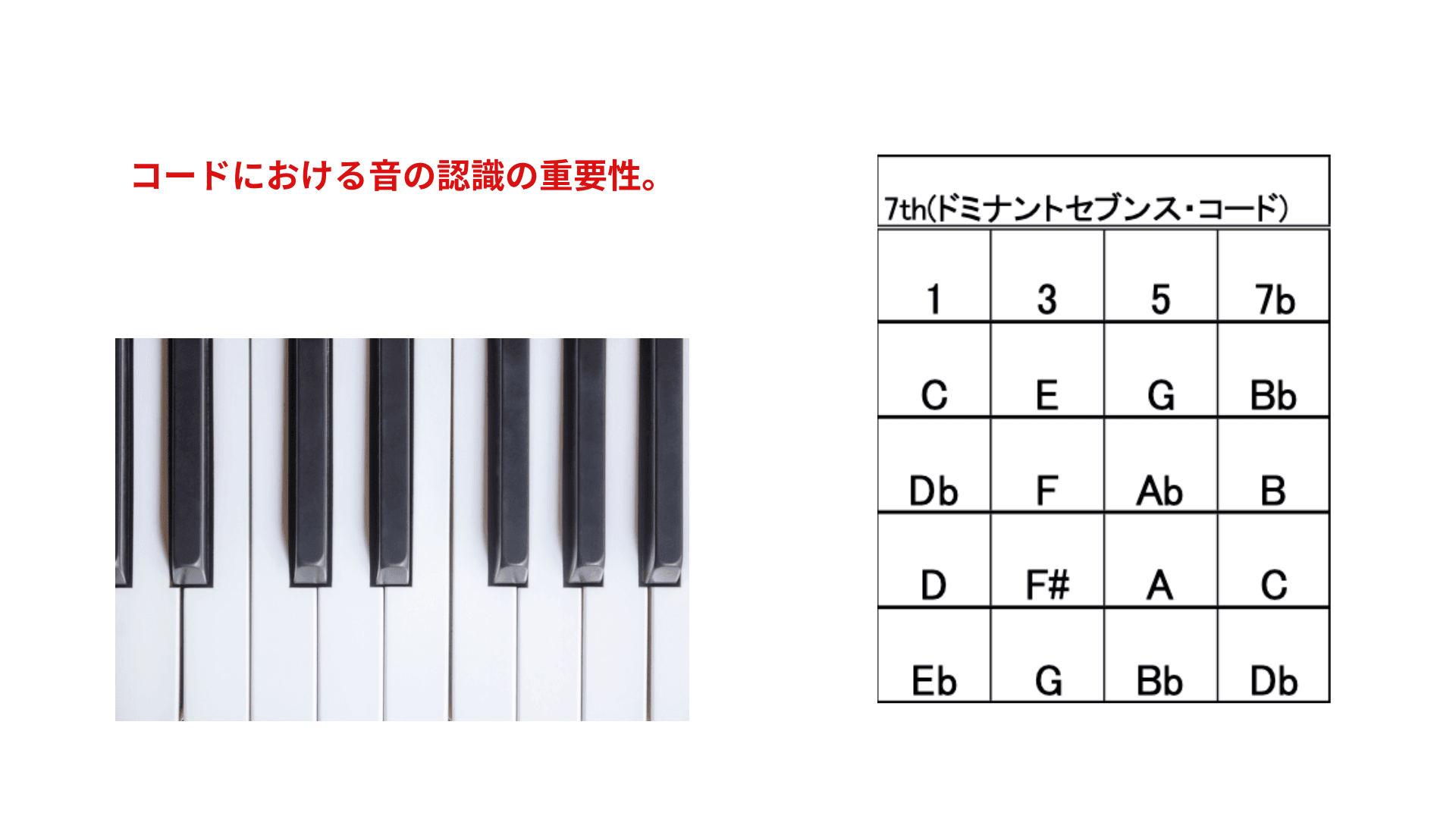 例えば、メジャー7thコードとドミナント7thコードの違いを即座に判断できる能力は、
