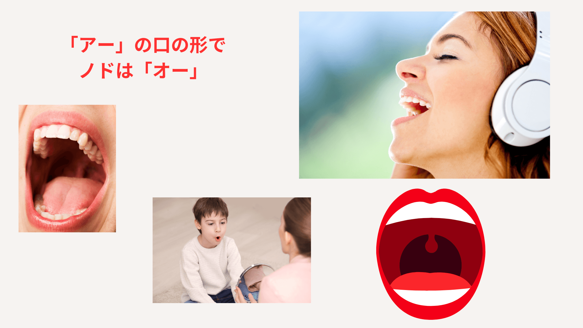 口が「ア」の形なのに対し、喉の中は「オ」の状態にするのが理想的です。