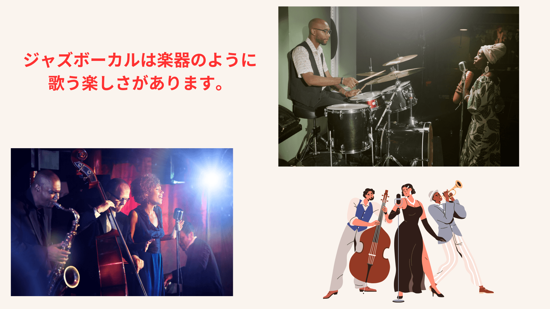 ジャズボーカルは、自分自身が一つの「楽器」として音楽に参加するスタイルです。