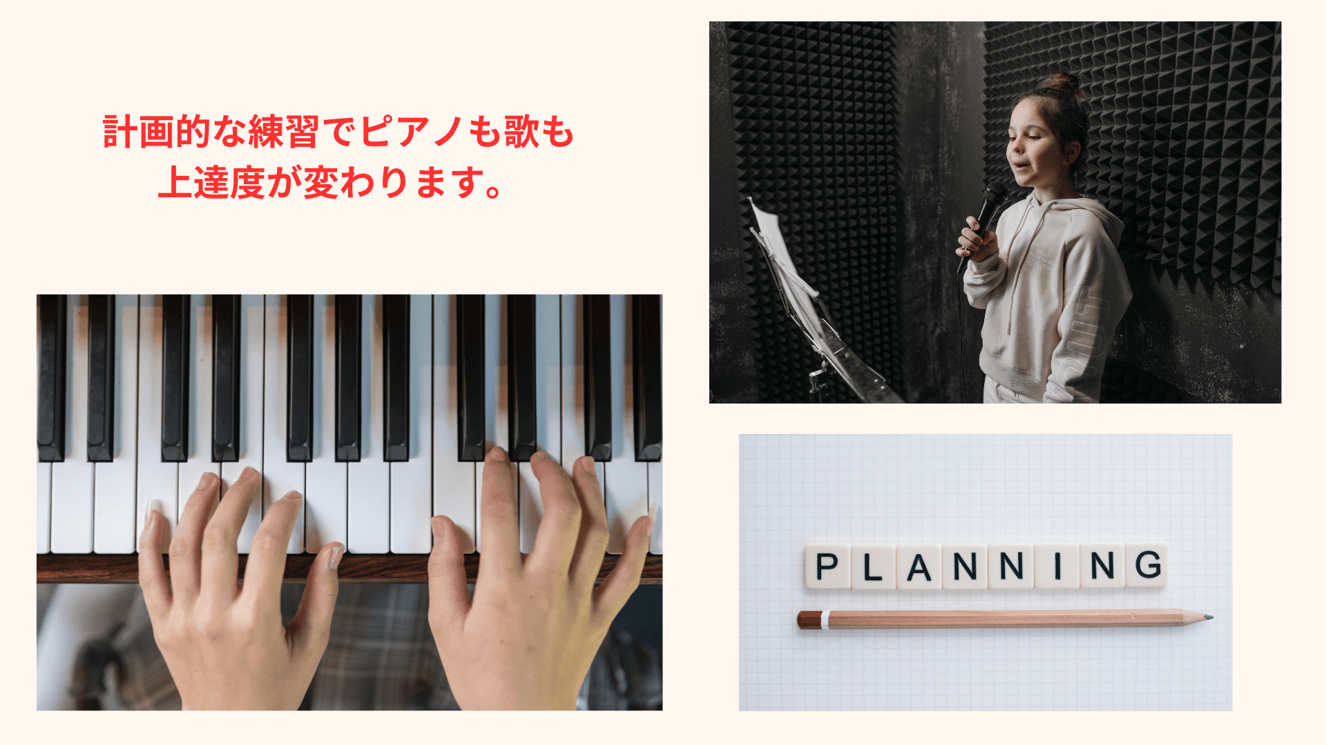 「発声練習」「曲の表現力」「音程トレーニング」に分けると効果的です。